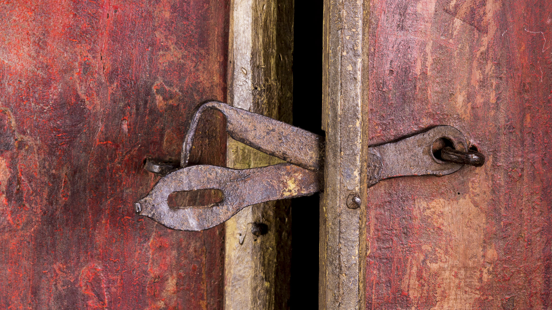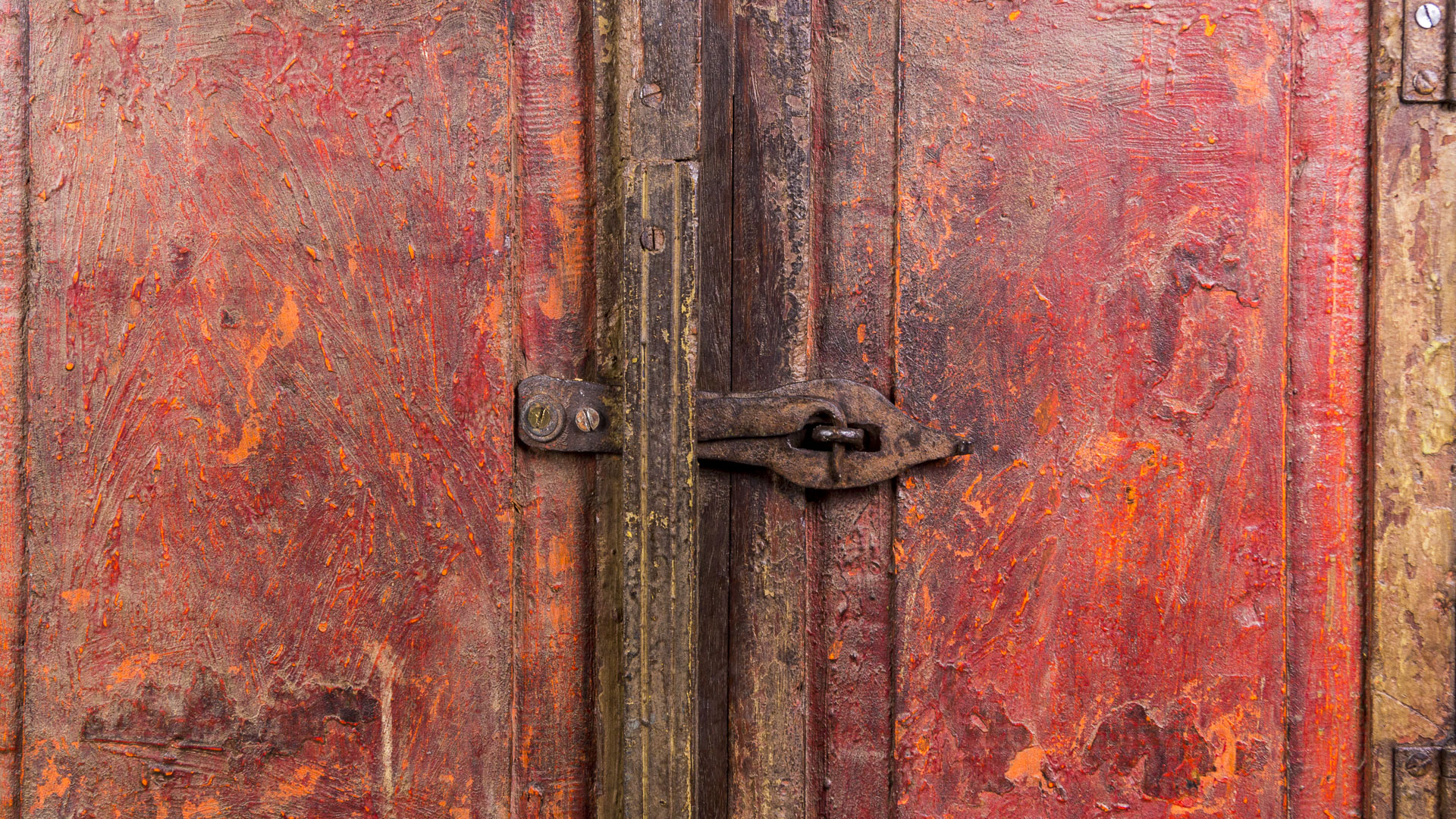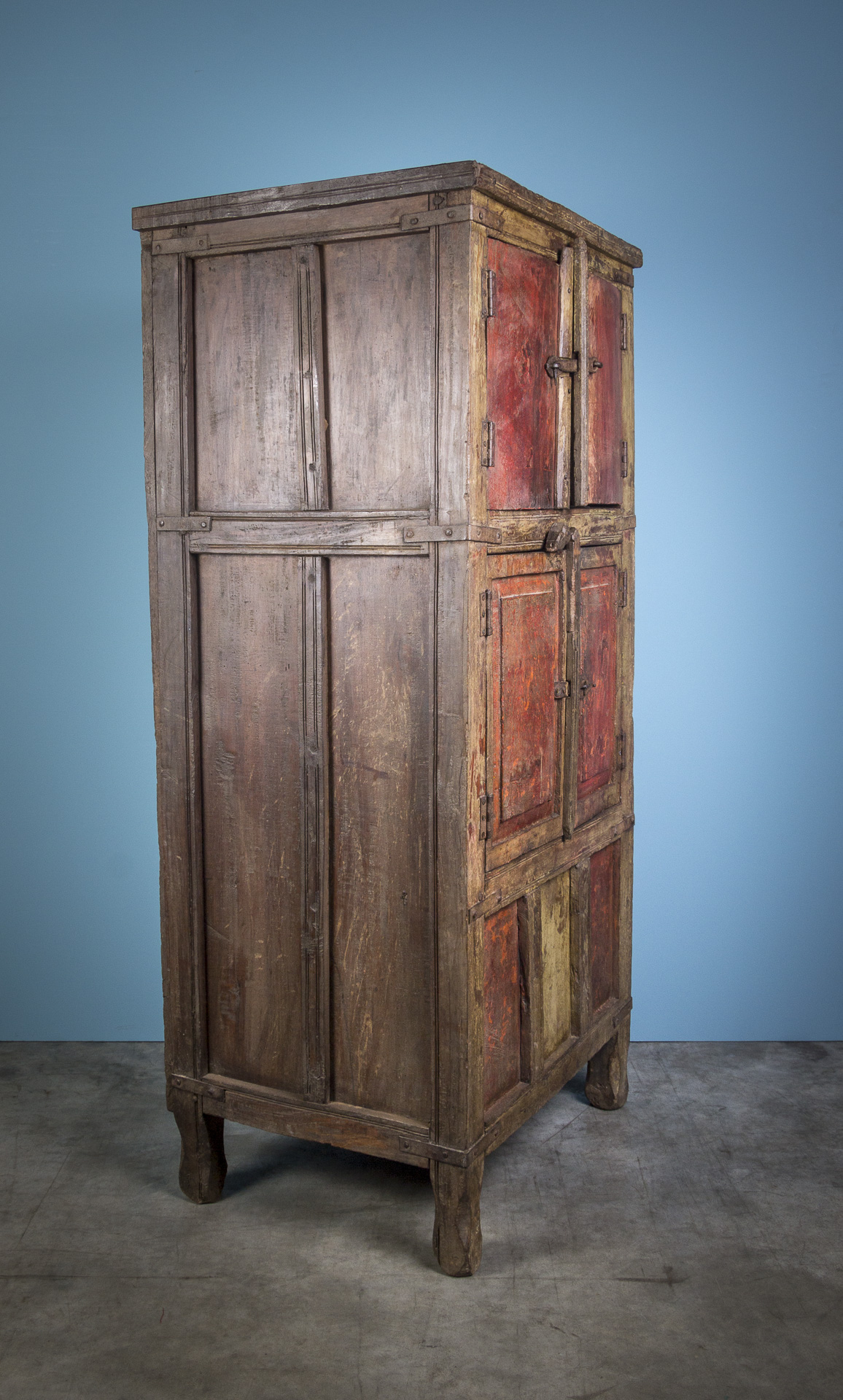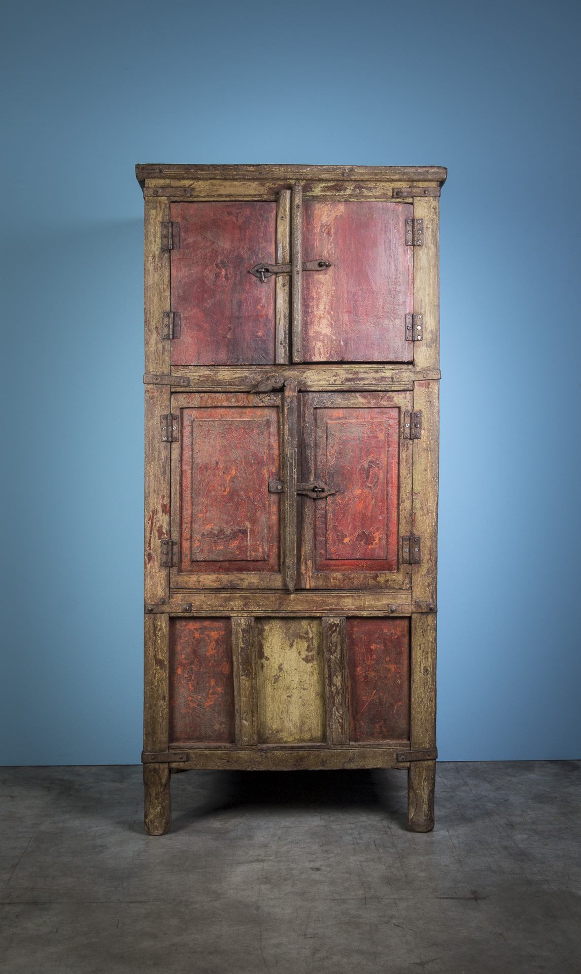 Madeira teca com duas prateleiras e fundo falso. Acabamento por processo de decapagem por camadas, em tons de vermelho e cor natural.