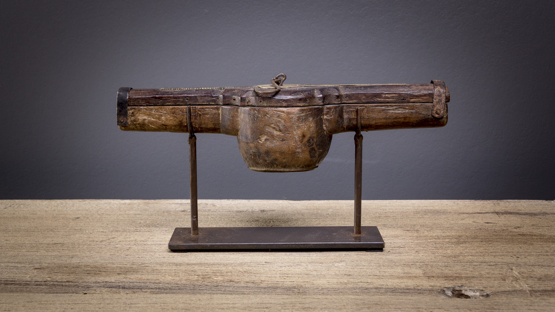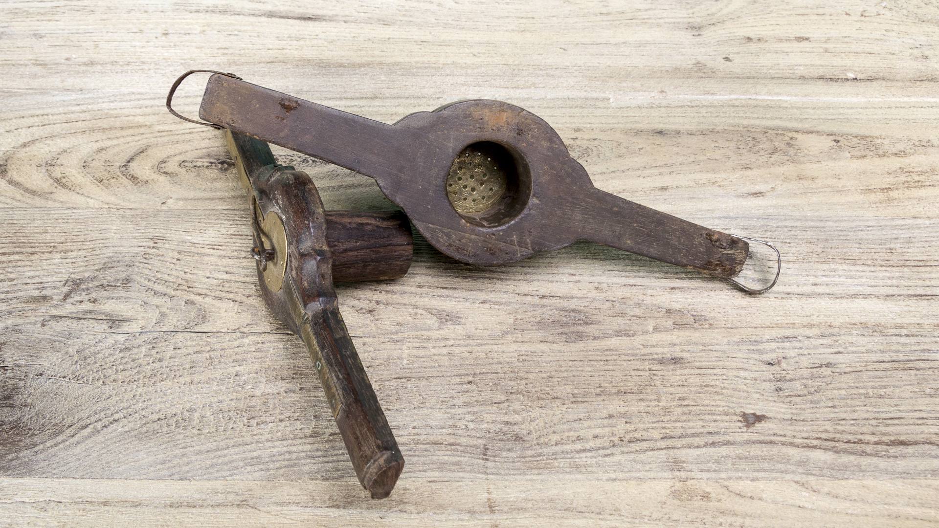 Exemplar único. Artigo da India, antigo, em madeira teca, geralmente utilizado para espremer limões e outros citrinos.
